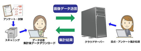 解答用紙を直接弊社にお送りいただかず、お客様でお持ちの複合機やスキャナでスキャンした画像データを送信いただきます。画像データはすぐさまデータサーバーに格納されマーク処理やデジタル記述採点をするために必要な編集加工を実施いたします。採点終了後はお客様ご自身でデータサーバにアクセスいただき、採点結果をダウンロードしていただく仕組みとなっております。